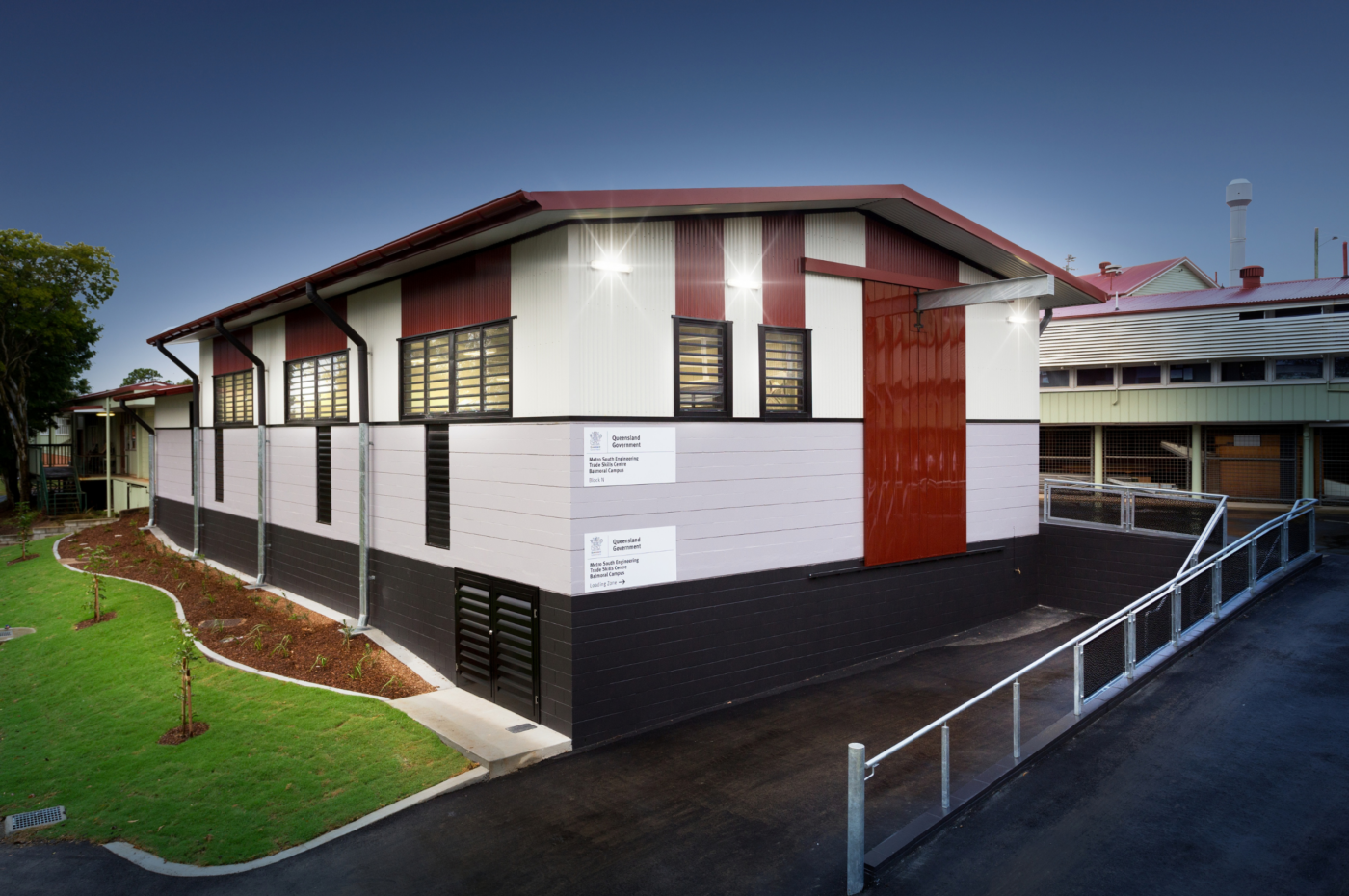 This project – the Metro South Resource Industries Trade Skills Centres – was one of three simultaneous new builds at Balmoral SHS, Runcorn SHS and Yeronga SHS in Brisbane. Managing all three new builds at different locations took careful coordination and staging of the construction programs. Finding subcontractors that had the capacity to work on two to three sites at one time was part of the challenge in meeting the contract completion date.
