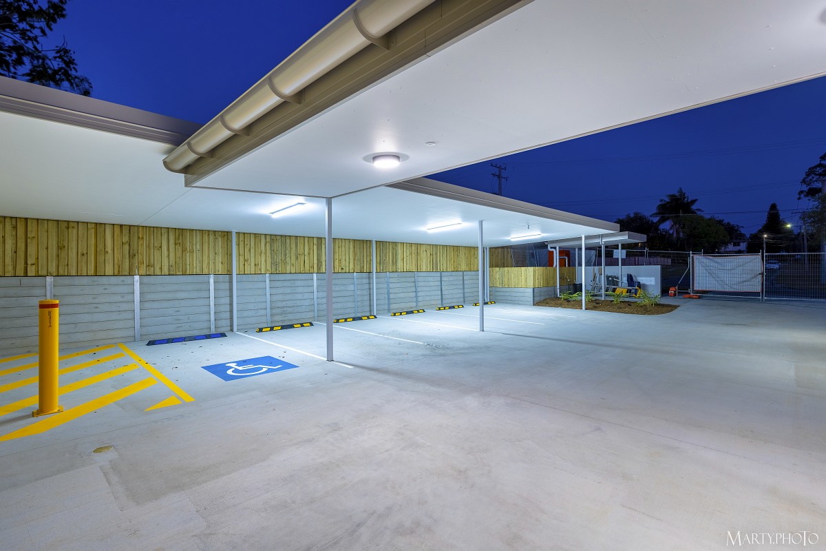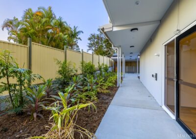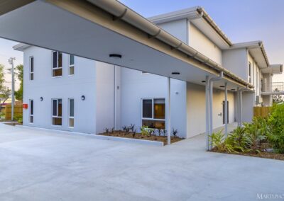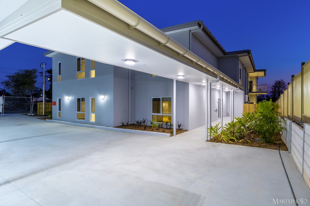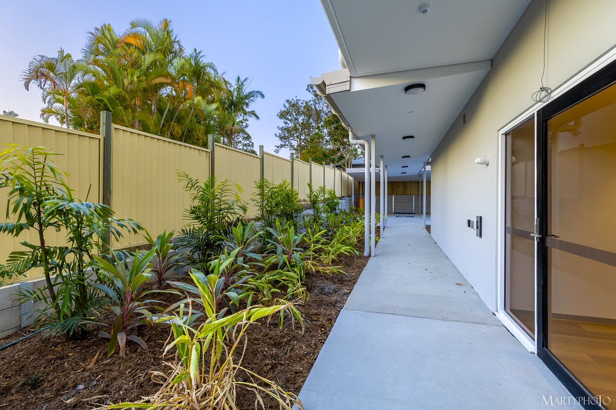 This NDIS project at 2 Sunset Street, Browns Plains, is a dual level apartment building with six units in total. The structure is mostly blockwork and steel structure with painted render finish and aluminium windows and balustrading.