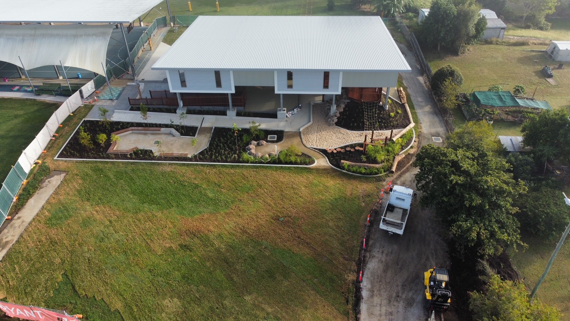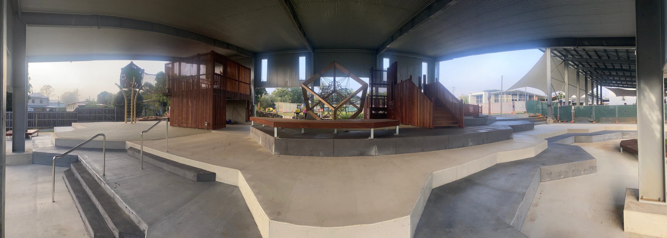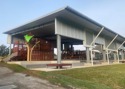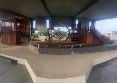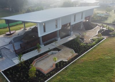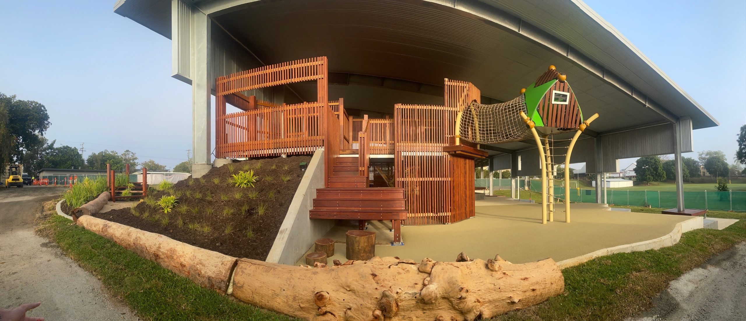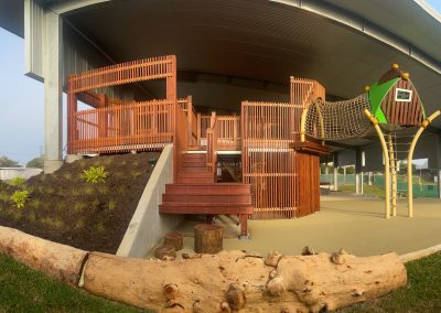 The playground consists of several enjoyable and playful elements like rock climbing wall, slides, cargo net, climbing areas and all located under roof for protection from the elements. There are several softfall zones throughout the playground to safeguard children. Incorporated into the zones are a number of landscaped features for children to sit and read or contemplate.